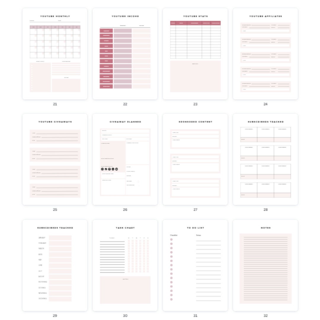 This YouTube Planner includes sections for video ideas, content calendars, target audience analysis, collaboration planning, analytics tracking, and more. It's an indispensable tool for content creators aiming to enhance productivity and grow their YouTube presence.